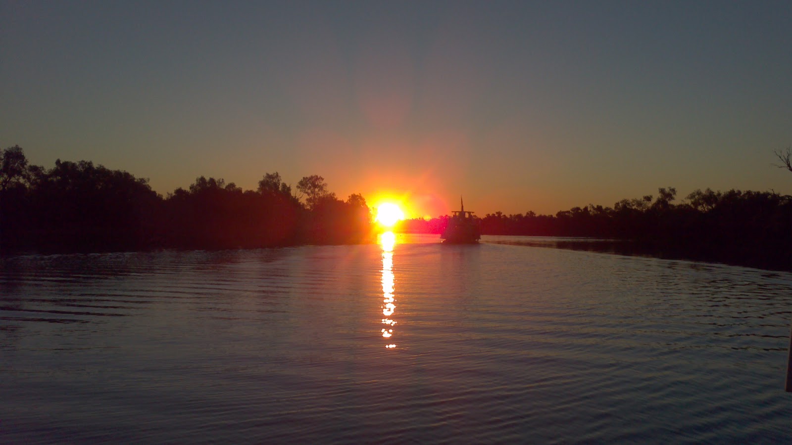 We drove from Winton to Longreach and what a difference a couple of hours make, this is a thriving community with tourism as one of it's leading attractions. We went and took photos of the "Stockmans Hall of Fame" and Qantas museum but we really went there to do the river cruise on the Thompson River. The cruise was magnificent. We went down the river and then they turned round and we headed back into the sunset so everyone could take photos, then we had a three course meal on the banks of the river (white table cloths and lanterns) and also two men singing bush songs and reciting bush poetry. We had a great time.